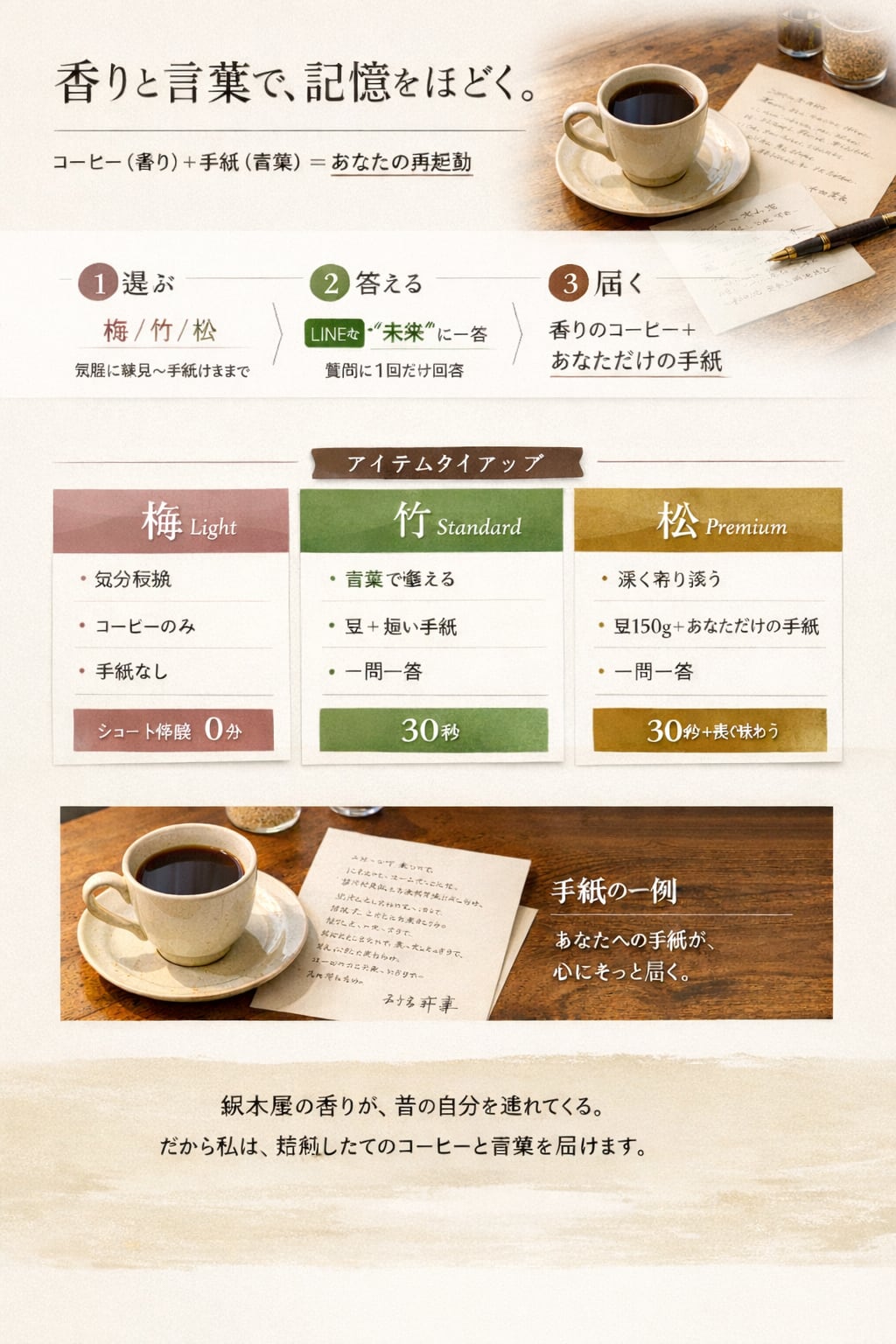 【4分回復】回復を習慣にするセット|White&dark各豆150g(約12日分)計300g+7日テンプレ+半年後の手紙(松) 安売りはしません。理由は簡単で、これは“豆”ではなく、回復の習慣を届ける商品だからです。 香りで戻り、言葉で整え、続けて強くなる。ここまでを一式にしました。 「回復のスイッチは香り。silver treeは鮮度で香りを最大化する。」 セット内容 自家焙煎コーヒー豆 150g(約12日分)×2 手紙習慣化テンプレ 7日分 1日1回、迷わず書ける形式 「半年後の自分からの手紙」(特別仕様) 刻印ワックス 上質な紙 こんな人へ 回復が必要なのに、毎回やり方がブレる ちゃんと休みたいのに、休めない “気分”ではなく“型”で整えたい 7日間の使い方(これだけ) 1日1杯、4分回復 テンプレを埋める(1分で終わる) 7日で「戻り方」が身体に入る 半年後の手紙で、自分の変化を回収する 注意 豆は挽き具合・抽出で味が変わります。おすすめレシピは同梱(または購入後案内)します。 手紙は、あなたを縛るものではなく、あなたを戻す“道具”です。 “1杯で回復する”を、習慣に変えたい人へ。これが最上位です。 「買うか迷うなら、まずは(梅)で感覚だけ試してください。 続けたいと思ったら(松)へ。贈るなら(竹)です。」